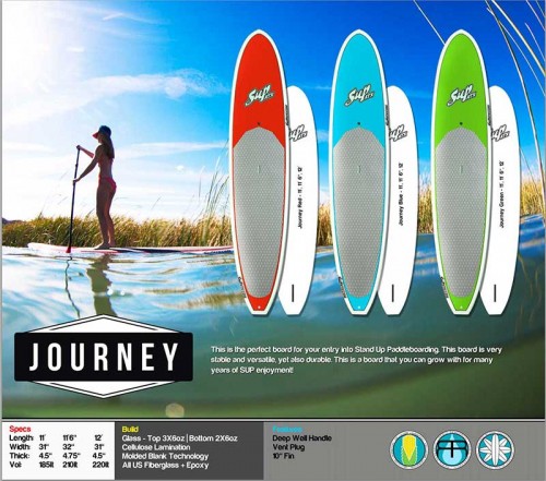 Durability and stability are the focus of the SUP ATX Journey line of paddleboards. This model features a functional shape that preforms as well in the coastal surf as it does in lakes, rivers and inland waterways. Cellulose lamination and molded blank technology promise that the Journey will provide years of SUPing for the whole family.