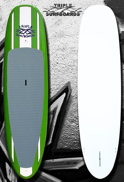 All our SUP's come standard with a genuine FCS 10 inch fiberglass fin, 2 FCS side fins, and double barrel concave bottom. All our SUP's are hand shaped for fast and maneuverable performance. Triple X's long double barrel concave bottom gives you stability, releases water to give you a nice glide, and gives you speed. The board glides easily on a wave, and rides rail to rail well for bottom turns, and cutbacks. All our SUP's are great wave riders, nose riders and flat water paddlers. SPECIFICATIONS