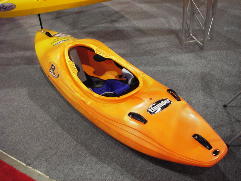 Riot Thunder: The new word for this season is "play-creeker" and the Thunder represents Riot's take on this nebulous form. Still considered to be in prototype, the floor model shows considerbly more refinement than the printed catalog I took from the booth, most ostensibly in the structural corrugations running the length of the gunwhales - it's shaping up quite nicely. Think technical creeker for small, low volume creeks with a very forgiving planing foot and you're in the right neighborhood. Promises to be an interesting little boat.