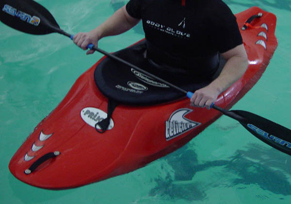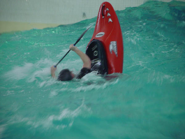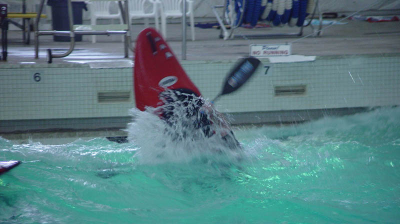 For anyone that hasn't been in a wave pool, they are kind of fun, and a good way to get some time in your boat during the off season without freezing. There are two wave generators at the deep end which emit waves in a concentric pattern. At the deepest point, the swells are about 3 feet deep from trough to peak. The pool gradually gets shallower causing the waves to break in a "surf zone" which can be surfed for short periods. There are some esoteric features of the wave pool. For one, the waves lose velocity as they progress to the far end. This means you only have a very short window to spin while the wave is still fast enough to keep the kayak planing; after that, the boat will sink into the pile and get mired. The Delirium was an excellent boat for me at 162# and gave me about as much time as I could hope for to make spins, and even at that I could only get 180 degrees of true spinning. You can see this in the video when I spin into my backsurf, I tend to get in front of the wave. In fact, just staying on the face of the wave and not outrunning it is more of a challenge here than anything.